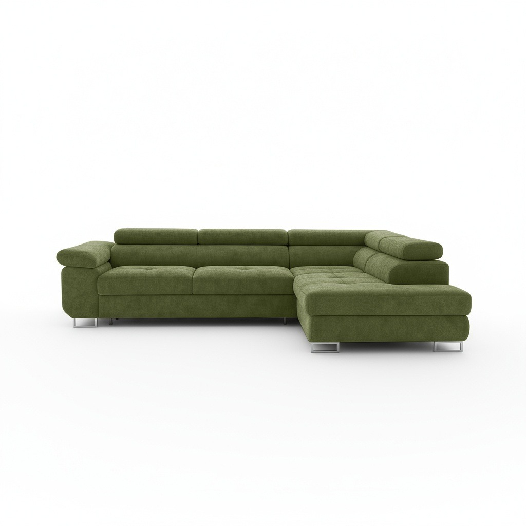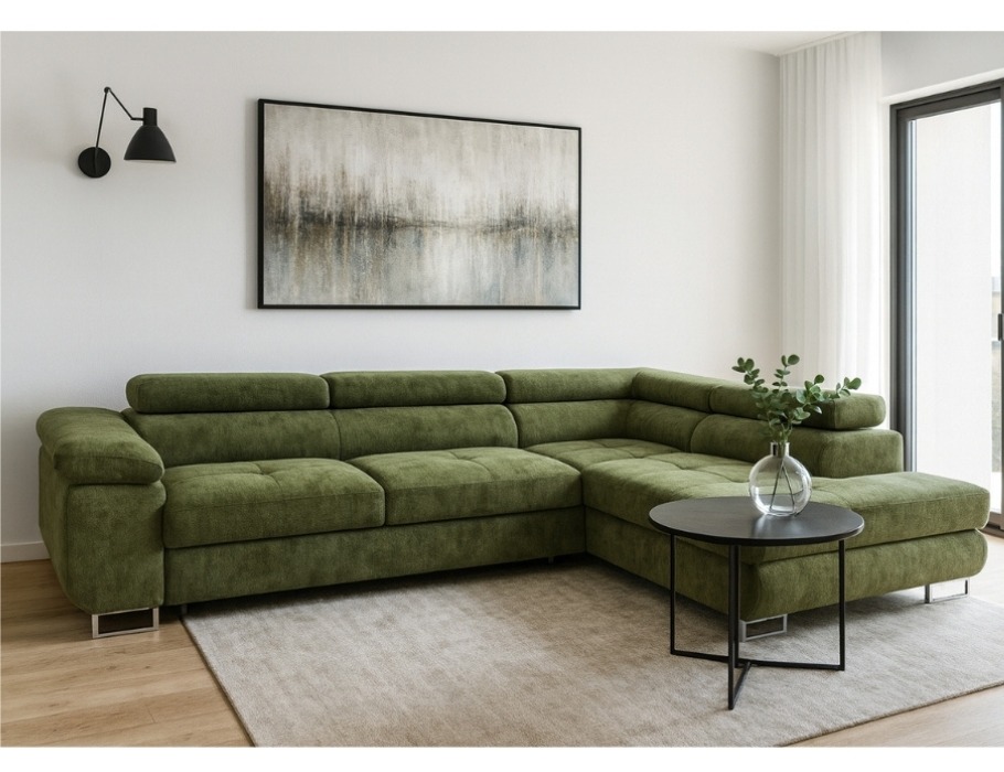 Jego lekka bryła opiera się na wysokich, chromowanych nóżkach. Nadają one całej konstrukcji subtelnej elegancji. Ustawny kształt litery L pozwala idealnie wkomponować mebel w przestrzeń pokoju dziennego. Co ważne, tapicerowany tył umożliwia ustawienie go nawet na środku pomieszczenia. Głęboki odcień khaki tworzy we wnętrzu atmosferę bliskości z naturą. Dlatego idealnie pasuje do aranżacji z drewnem, beżem lub stonowanymi szarościami.